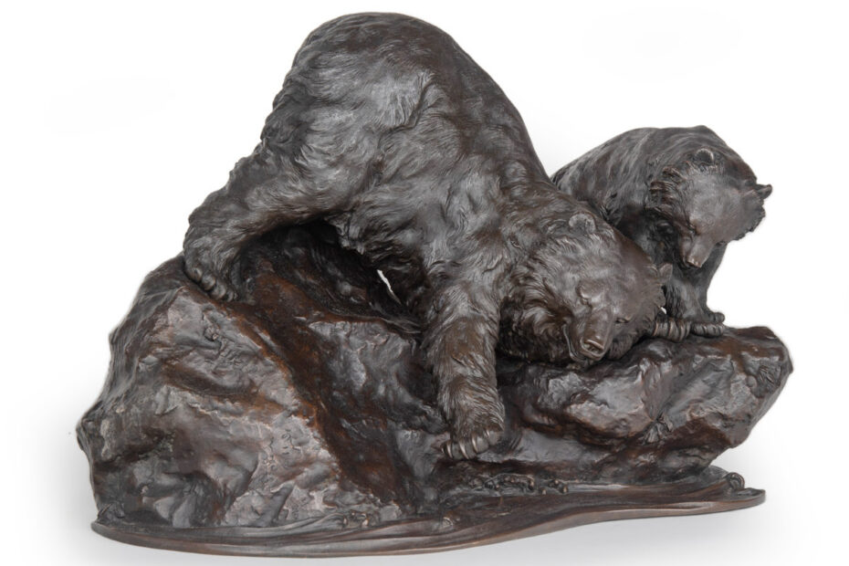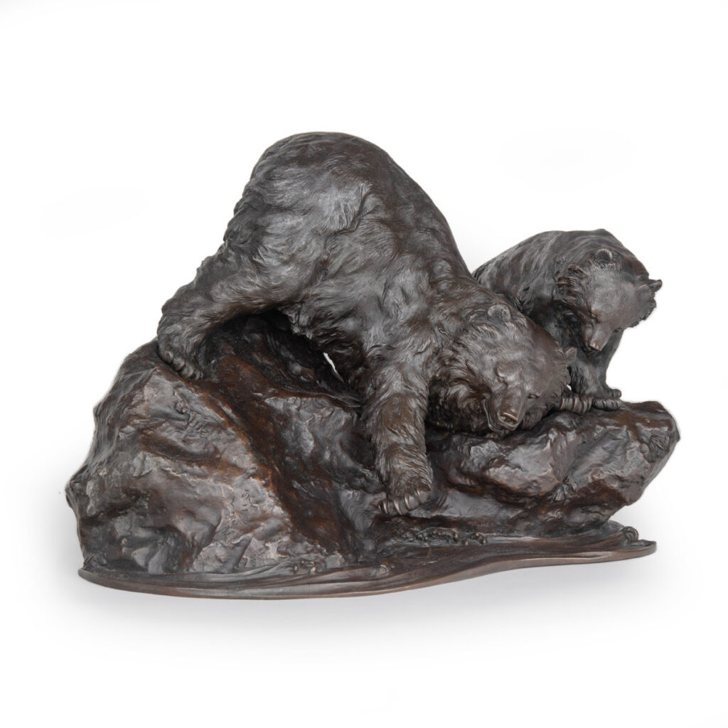 This month’s exclusive featured item is this most charming bronze okimono group depicting an adult bear teaching its cub the art of salmon fishing, the okimono fully signed by the highly regarded and well recorded artist Kaniya Kuniharu.