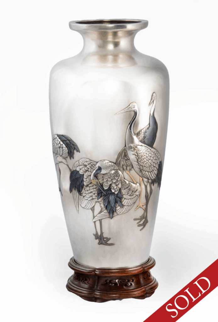 Our most beautiful pure silver and mixed metal vase depicting Manchurian cranes, found a new home with a long-standing European client.
