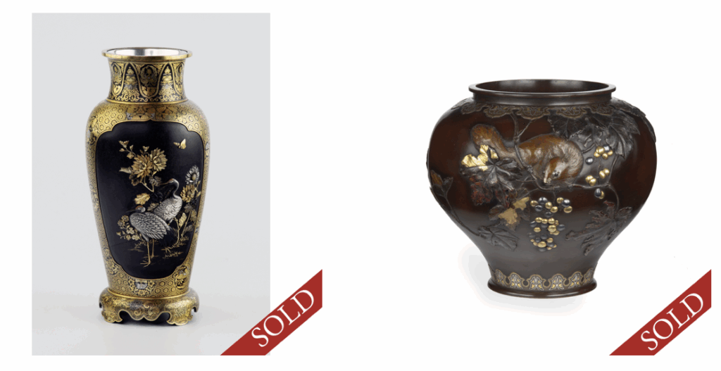 I have previously likened the finest Japanese metalwork to a drug, a kind of legal high that you simply cannot get enough of, the very best items get “right under your skin”, and they never really leave you. I fondly recall such masterpieces as the cannon shaped vases by Yoshizane, son of the great Shoami Katsuyoshi, now residing in a Japanese museum collection. The mind blowing quality crab okimono by Yamada Motonobu, again returned to Japan. Both the Unno Shomin box and the Takachika silver Hawk koro are now resting in a very special USA collection. Who could forget the sensational Kajima Ikkoku vase now also in a USA collection, and last but not least, the incredibly rare Chokichi Squirrel Jardiniere safely nestled in a seriously good UK collection. It was so difficult to pick just a few of the very special pieces, that whilst gone, have never actually left me, if you follow. And so, remains the challenge to unearth the next masterpieces.