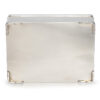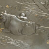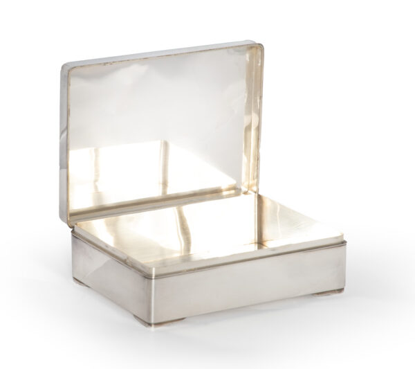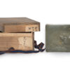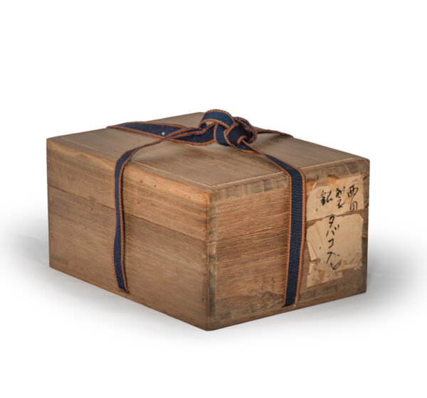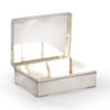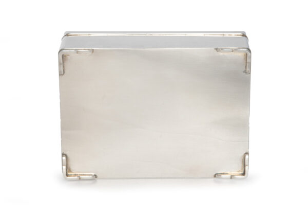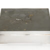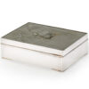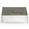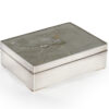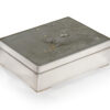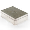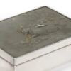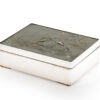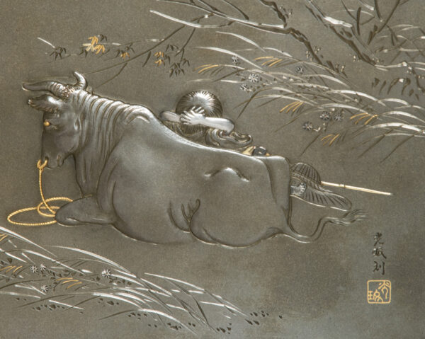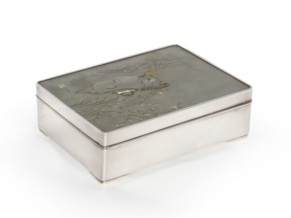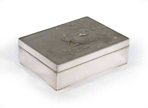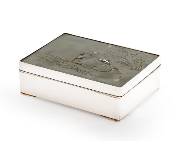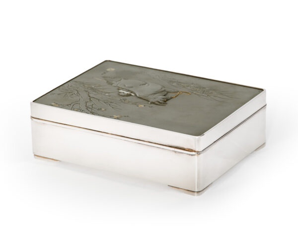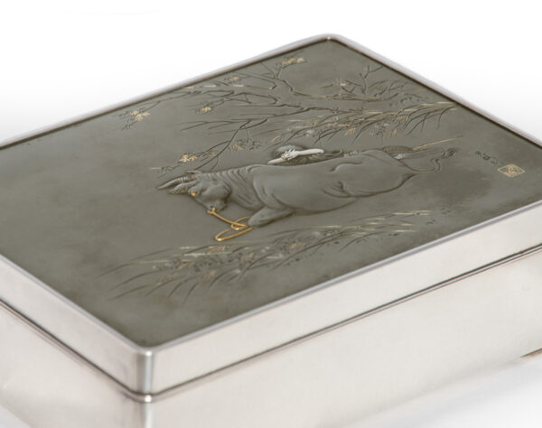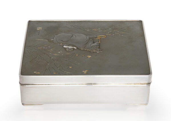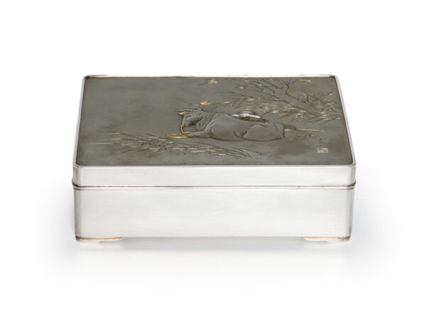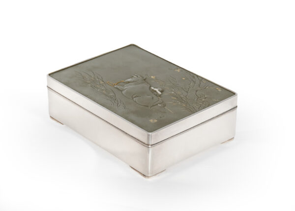 As part of our Japanese works of art collection we are delighted to offer this most charming Meiji Period (1868-1912) pure silver table / trinket box artist signed and sealed and complete with its original tomobako. The rectangular hinged box stands upon four bracket feet, the shibuichi panel to the lid is exquisitely carved in katakiribori by a highly regarded and well recorded artist in this field, and depicts the most charming subject matter of a young attendant at rest upon the loins of his recumbant water buffalo, his hands clasped above his head whilst his hat and cane can be seen at his feet. The artists fine carving further highlighted with gold and silver inlays. The lowwer right hand corner carries the script signature and gold seal for the artist Sugiura Komin . A most delightful super quality and functional box as an addition to your Japanese works of art collection or as an ideal gift for a loved one.