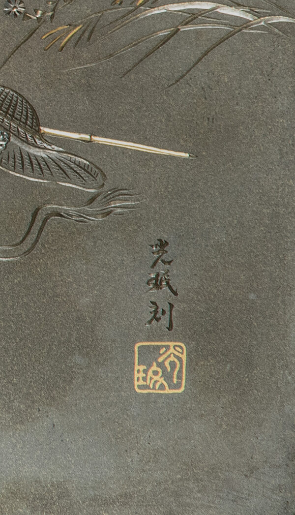 Sugiura Komin is listed on page 715, volume A-K, in the index of Japanese sword fittings & associated artists by Robert E Haynes, reference H 03459.0. He was a student of Kashima Ikkoku. Sugiura Komin excelled in inlay and katakiri-bori engraving techniques.