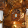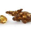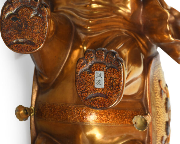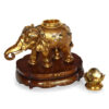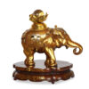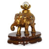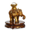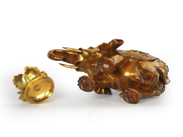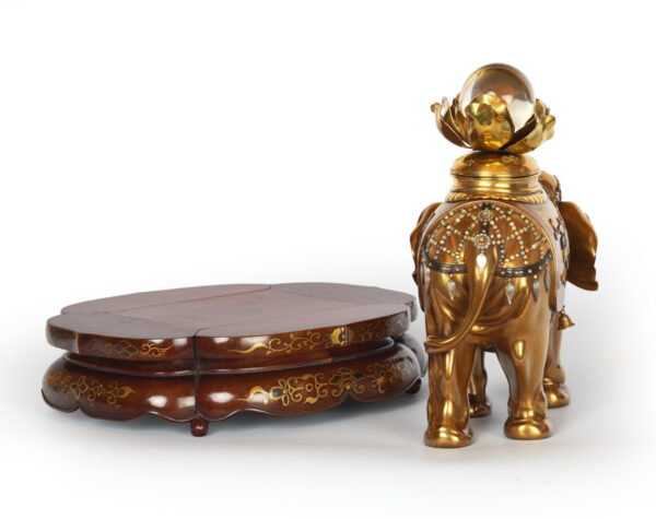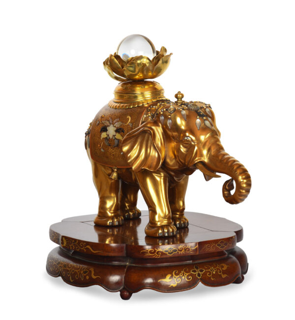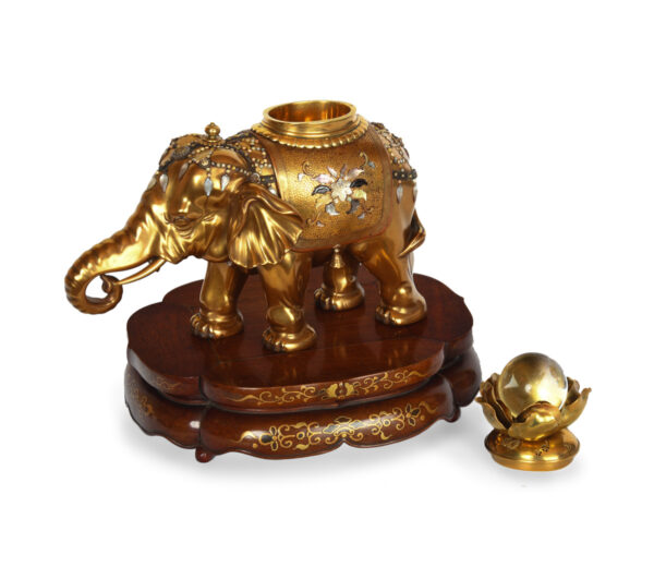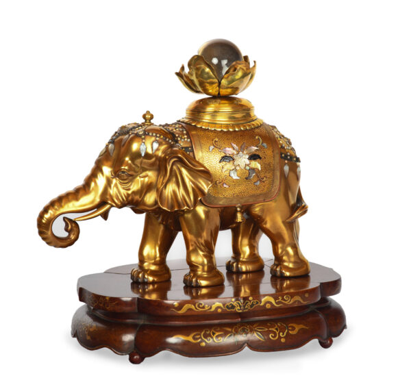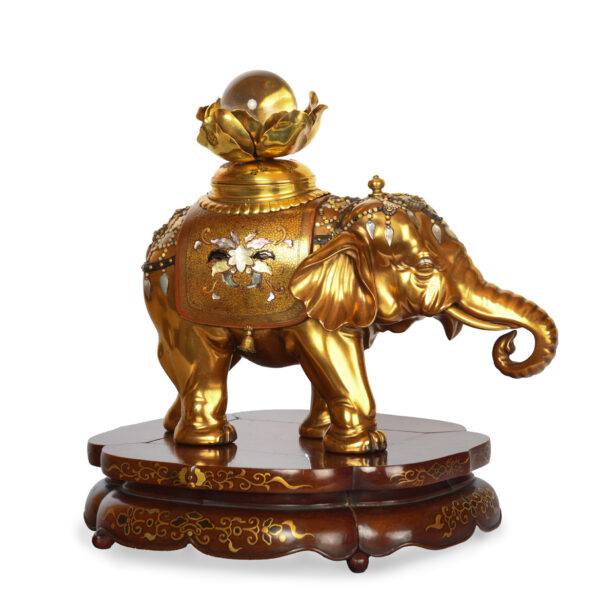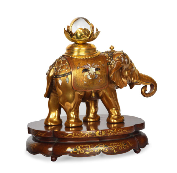 As part of our Japanese works of art collection we are delighted to offer this exceptionally fine Meiji Period (1868-1912) gold lacquer Shibayama encrusted Koro in the form of a caparisoned elephant. The magnificent beast stands resplendent upon its period hardwood and gold lacquer stand, its head and back bejewelled with semi precious stones and shells each inlaid to an exceptional standard by a well recorded exponent of this type of decoration, generically refered to as Shibayama. The elephants back houses a Shibayama decorated blanket upon which rests a gilt lined recepticle formed as a pierced lidded koro, surmounted with a crystal ball within a large lotus bloom. The elephants tusks are also fashioned from gilt metal. The beautifully carved facial expression, in particular the eyes, give the impression of a very happy and content elephant, the silver signature seal inset beneath one of the front feet refers to the recorded Shibayama artist “Masatomo”. An increasingly scarce jewel of an okimono that would sit well in any setting of your choice.