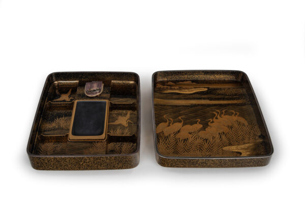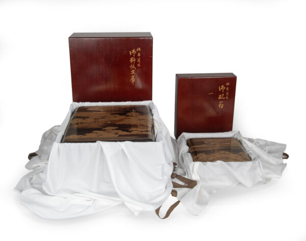 As part of our Japanese works of art collection we are delighted to offer this remarkable condition Late Edo/ Meiji Period (1615-1868/1868-1912) matched suite of lacquer consisting of a Suzuribako writing box and Bunko document box, each contained within their individual tomobako storage boxes. The sumptuous decoration depicts scenes of the Sumiyoshi Shrine delicately worked in various lacquer techniques including takamaki-e, hiramaki-e and nashiji against a roiro ground, the interior of the suzuribako depicts cranes amidst rushes at the waters edge , the rims of each box silver lined, the storage boxes each inscribed Sumiyoshi Makie in gold script.