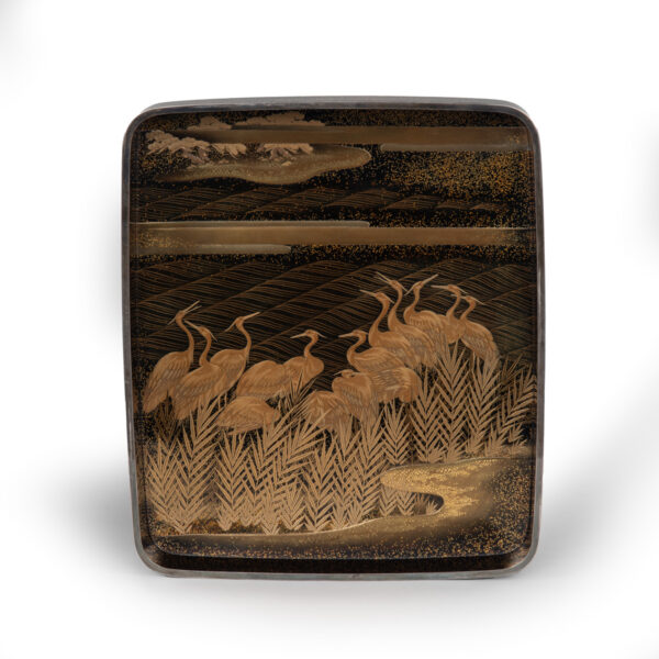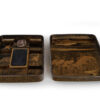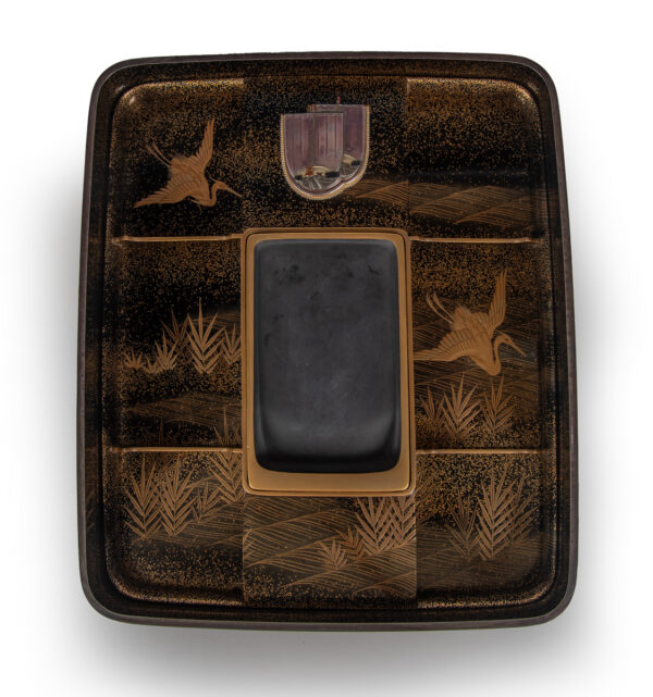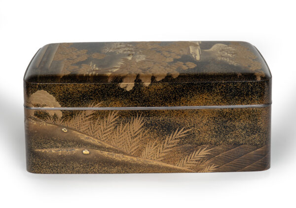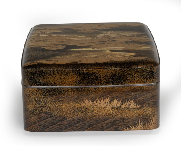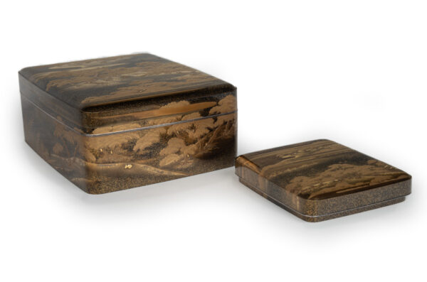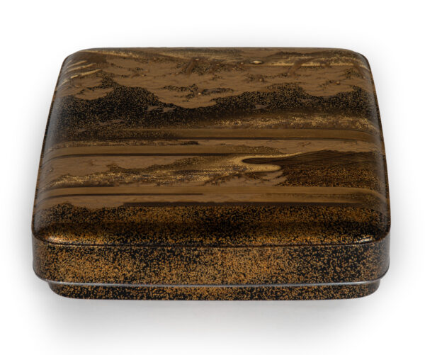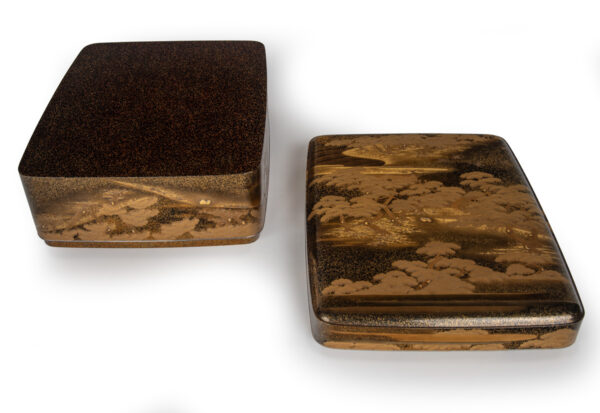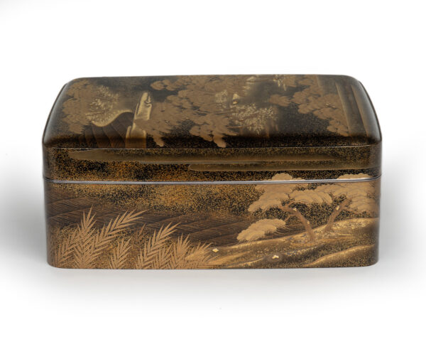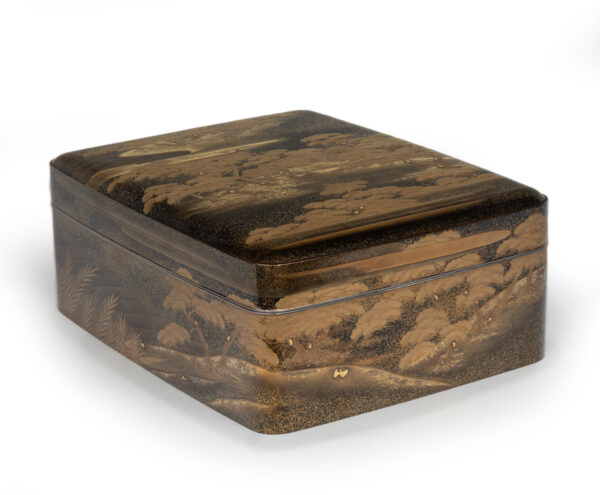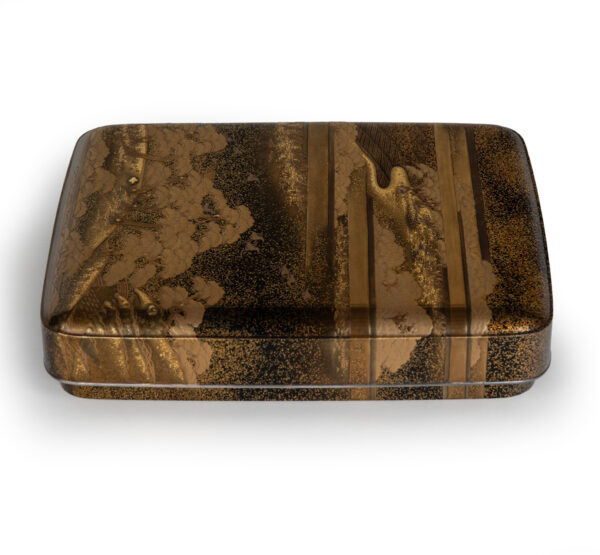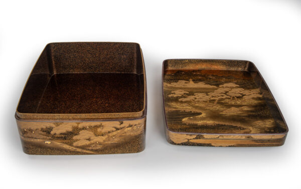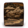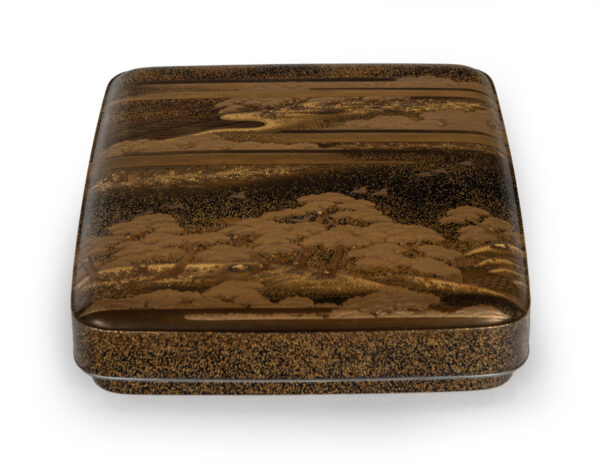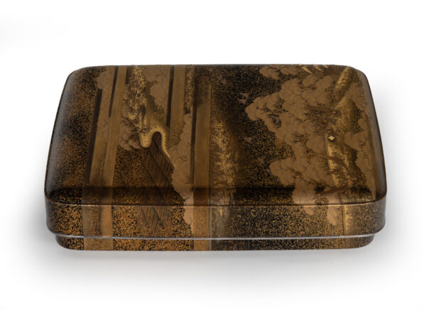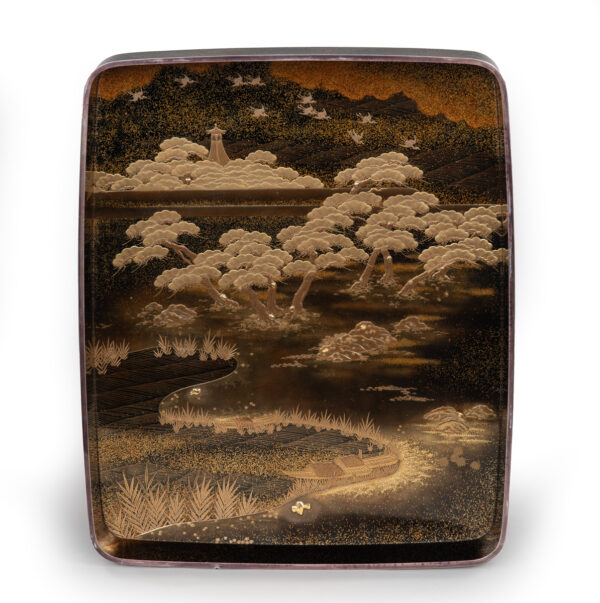 Sumiyoshi Makie (すみよしまきえ) A type of makie decorative design. It depicts the torii gate, drum bridge, pond, and shrine buildings of Osaka’s Sumiyoshi Shrine, with pine trees arranged around them. From the Momoyama period onward, this motif—derived from classical court literature such as The Tale of Genji and The Tale of Sumiyoshi—was widely used as a traditional design in makie. Thin sheets of gold and kirigane (cut gold foil) were lavishly employed, and the design was commonly applied to writing desks, tebako (cosmetic or accessory boxes), suzuribako (writing boxes for inkstones), and natsume (tea caddies).