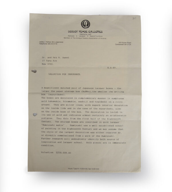 Eminent Australian collection , previously supplied in 1987 by Lesley Keyhoe Galleries , Melbourne. Comes complete with descriptive valuation .
