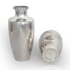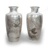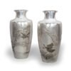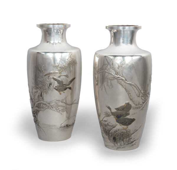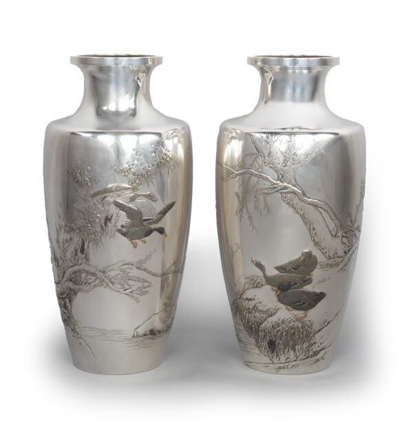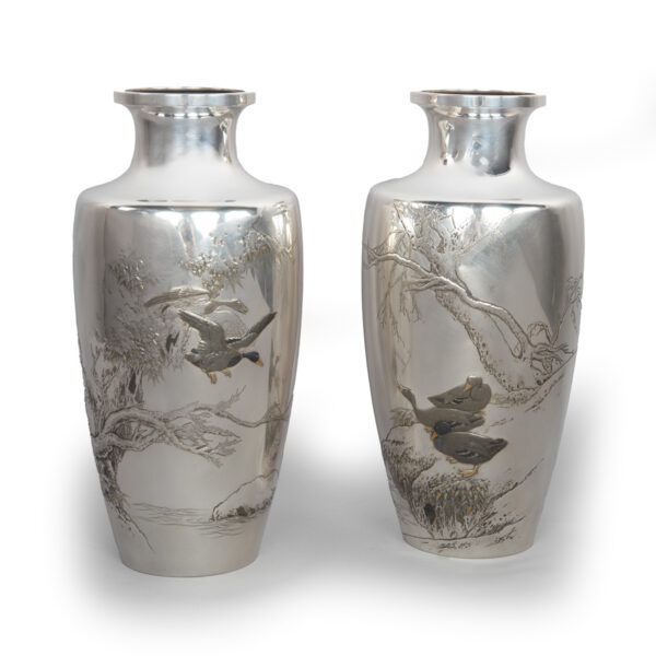 As part of our Japanese works of art collection we are delighted to offer this most appealing pair of Meiji Period (1868-1912) pure silver mixed metal vases, each fully artist signed and bearing the Shobido company seal. The finely worked vases decoated with highly sought after scenes of birds in snowy winter landscapes and waterside settings . The left hand vase depicts ducks in flight within a backdrop of snow covered foliage, the opposing vase depicts a group of mixed metal ducks upon a snow covered lakeside bank, each vase finely chiselled by the recorded Meiji Period artist, Kobayashi Shoun. The engraved signature on the vases reads ” 照雲刻 Shoun koku” (Engraved by Shoun), whilst the underside of each vase is sealed by the Shobido Company. The vases come complete within their original tomobako storage box , itself inscribed ” Hakugin kabin, kacho koku, ittsui ” translating to read (A pair of white silver vases, with the design of birds and flowers).