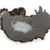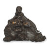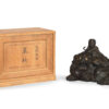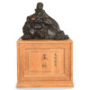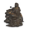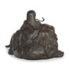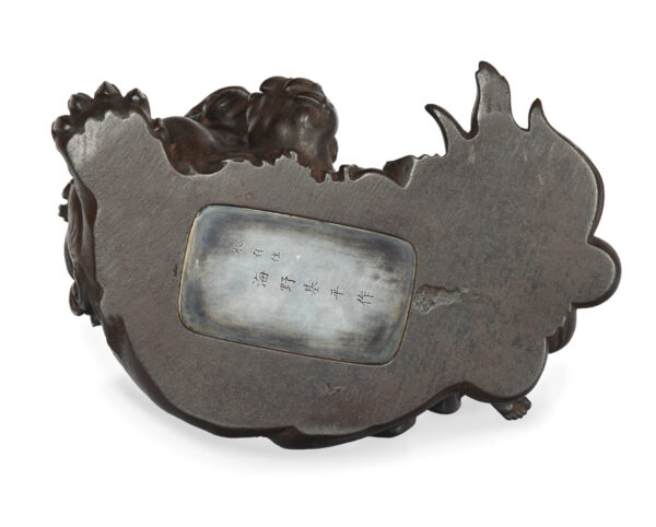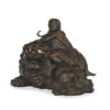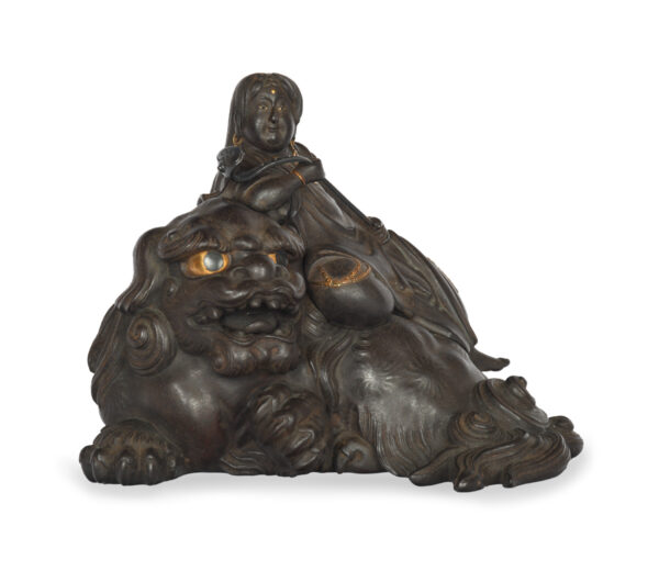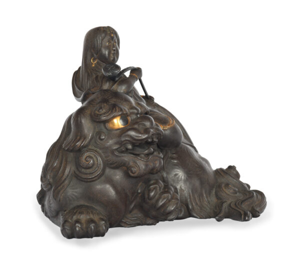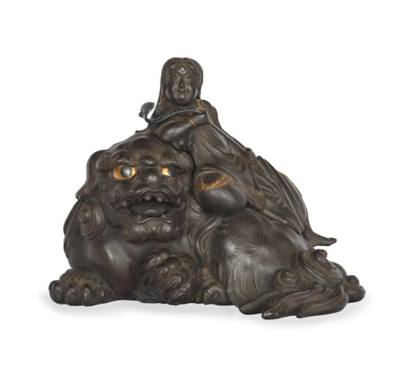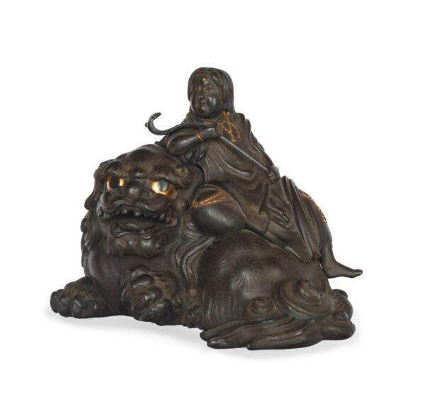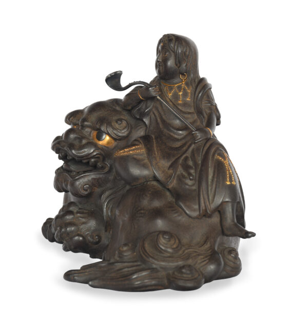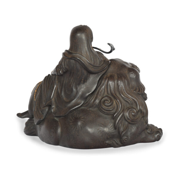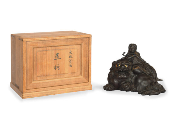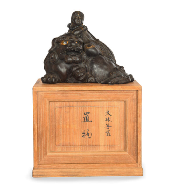 As part of our Japanese works of art collection we are delighted to offer this most rare late Edo period iron okimono by Unno Shomin (1844-1915), the serene sculpture depicts Monju Bosatsu seated upon a large lion dog (Shishi) whilst clutching a detatchable silver sceptre. The jewels adorning his body inlaid in gold, the shishi’s eyes of gilt with black pupils, the base inset with a silver plaque and signed in chiselled characters Suifu no ju Unno Motohira saku (made by Unno Motohira in Mito). The okimono fits snugly within its original tomobako, the inscription reads, Monju Bosatsu okimono, the inside of the lid inscribed Monju Bosatsu no zu tetsu okimono, Unno Shomin sensei Mito zaiju seinenki no saku Motohira zaimei (Iron okimono of Monju Bosatsu made by Master Unno Shomin when he was young and living in Mito, with signature Motohira) and signed Hakuzanshi Toyokawa Mitsunaga no sho (certified by Hakuzanshi Toyokawa Mitsunaga, (probably II ) with two seals Hakuzanshi and Shinryusai.