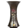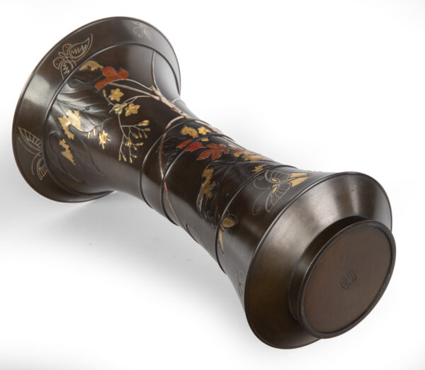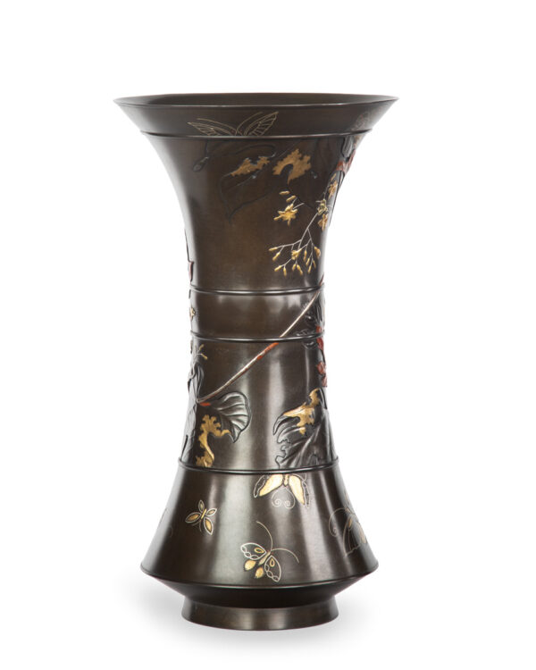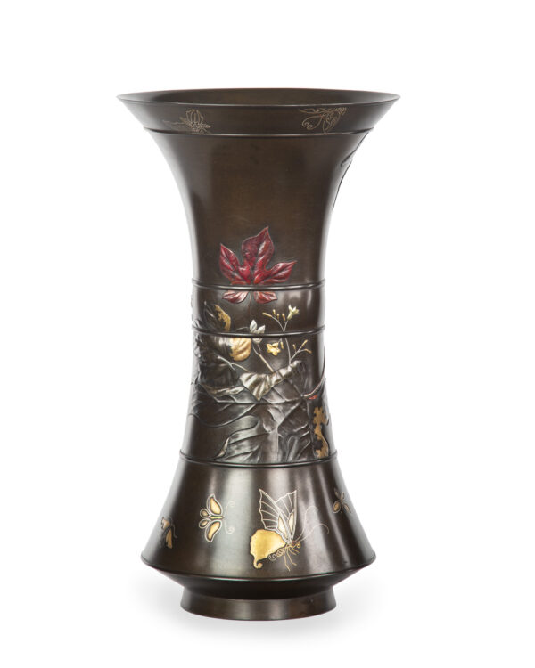 As part of our Japanese works of art collection we are delighted to offer this fine quality Meiji Period (1868-1912) bronze and mixed metal vase by the highly skilled Imperial artist Suzuki Chokichi, his art name Kako. On this occasion Chokichi has manufactured a bronze trumpet shaped vase of waisted form decorated in exquisite detail with the use of mixed alloys, the main body of the vase is predominately decorated with sprigs of native flora contrasted with Chokichi’s trademark patinated mixed metal foliage. The vase is further decorated with upper and lower bands of butterflies in flight between formal gilt borders, the underside of this heavy quality highly decorative vase is signed within an oval cartouche that translates to read “made by Kako of great Japan”, an increasingly scarce example of Meiji Period metalwork from a leading Imperial artist.