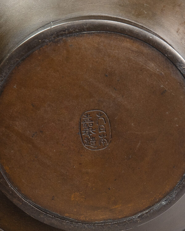 It was following on from this closure that Chokichi went on to produce many other individual high quality and now famous works housed around the worlds great collections and leading museums , including a monumental 2.8m Koro surmounted by an Eagle which resides in the Victoria and Albert museum, and arguably his most famous known work being a set of twelve mixed metal birds of prey, now rightfully resting in the Tokyo national museum . It was during this period that this vase would have been manufactured by Kako, having now replaced the company double mountain seal with his own unique oval signature. Suzuki Chokichi’s work was eventually rewarded in 1896 when he was granted the rare accolade of becoming an Imperial artist ( Teishitsu Gigeiin ).