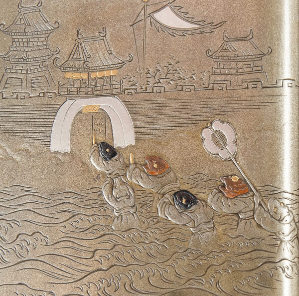 As part of our Japanese works of art collection we are delighted to offer this most unusual Meiji Period (1868-1912) shibuichi and mixed metal decorated vase by the highly acclaimed Ozeki company metalworker Yamada Motonobu (1847-1897), his art name Inshi. Here Motonobu has crafted a mixed metal cigarette case of rounded rectangular form, the case opens on a spring push to reveal a silver liner . The scene on the exterior depicts a procession of fish dressed in robes, apparently wading through water to reach a silver arch beneath a group of temples in the foreground, the most unusual scene continues to the reverse where mixed metal seaweed and shells are also depicted below the artist signature, which reads Inshi Motonobu Koku. It is interesting to note when studying the artists remarkable chisel work that appears to capture the entire scene eminating from the giant clamshell, very subtle changes to the shibuichi ground are detected. A fascinating example of Japanese folklore bought to life in mixed metals by one of the leading artists of the 19th century.