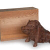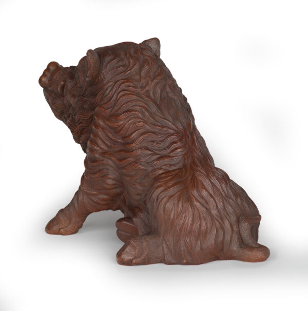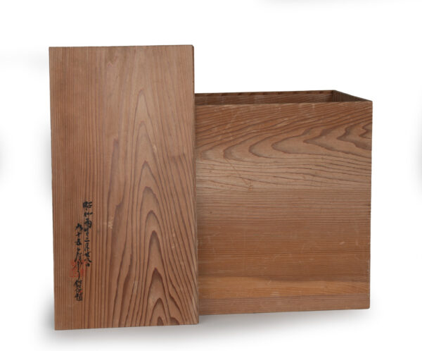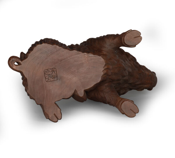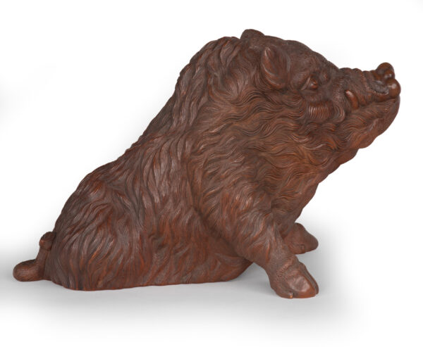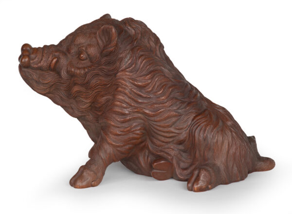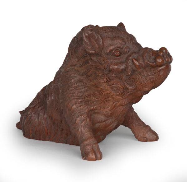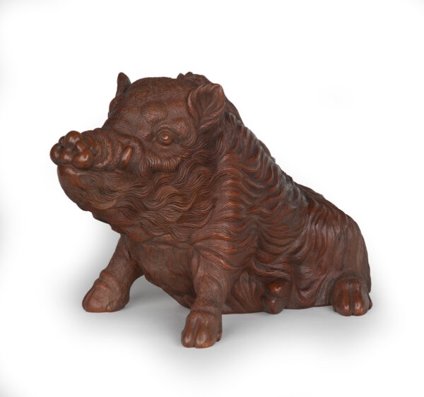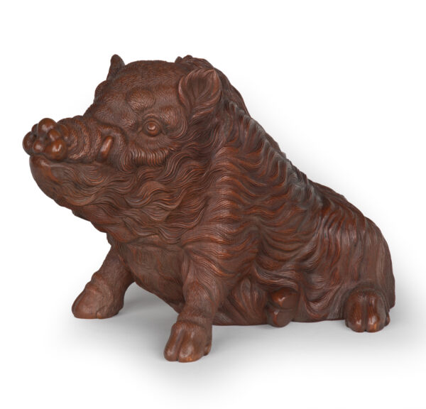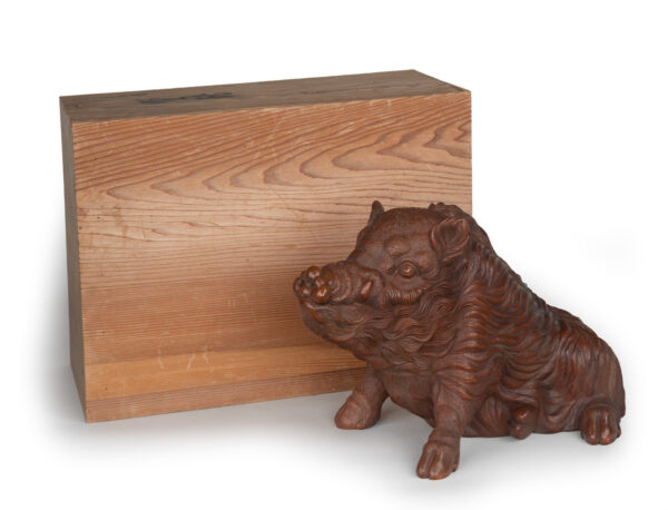 As part of our Japanese works of art collection I am delighted to offer this magnificent Meiji Period (1868-1912) carved hardwood okimono of a wild boar ( inoshishi) complete with its original tomobako, each of which are fully signed by the Imperial Household artist ( Teishitsu Gigei-in) Ishikawa Komei ( 1852-1913) . The incredibly well carved beast sits resplendent upon its haunches, head raised in an alert pose, the rendering of the carved fur and particularly its facial features are instantly recognisable as the work of a very highly skilled artist. The tomobako is fully signed “Ki chokoku, Yacho, gyonen rokujuissai, Komei, with the seals “Teishitsu Gigei In” and “Ishi” for Ishikawa. translating to read “Wood sculpture of a wild boar, made by Komei, at the age of 61” The underside of the okimono bears a crisply carved seal “Komei no in” the seal of Komei.