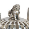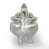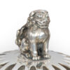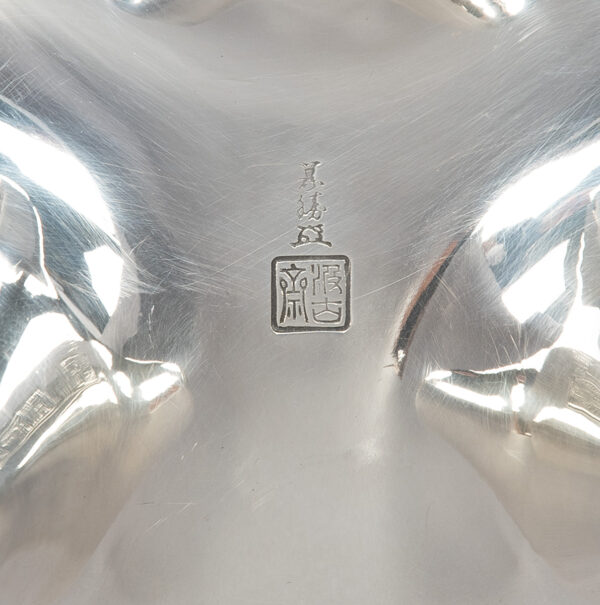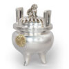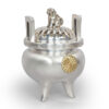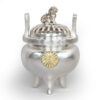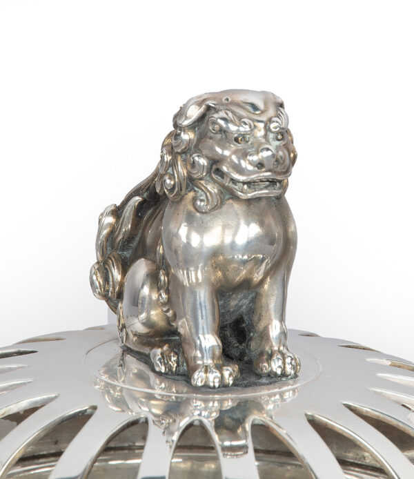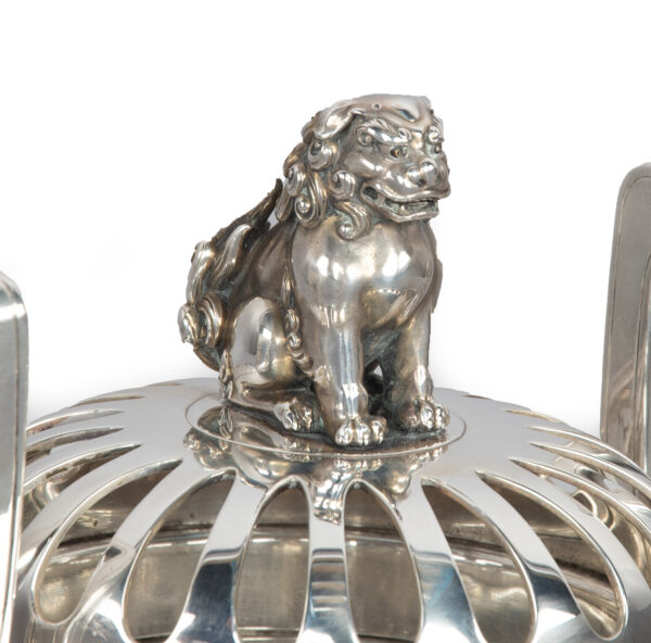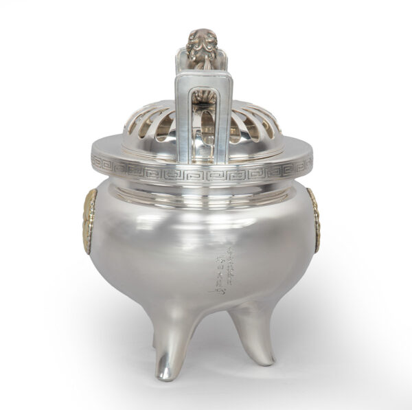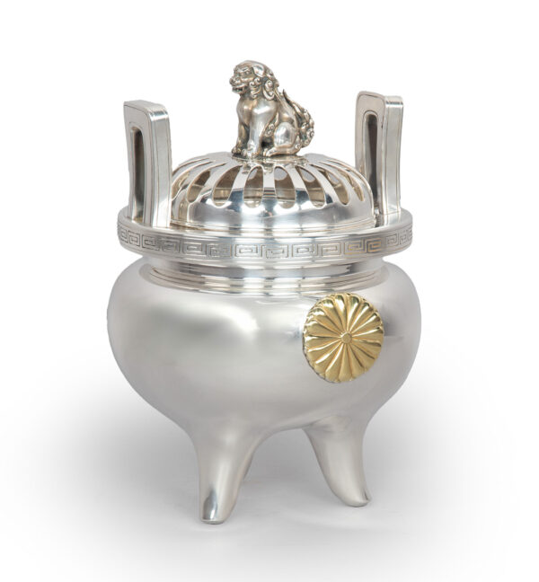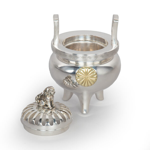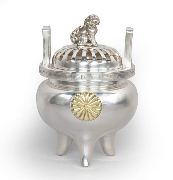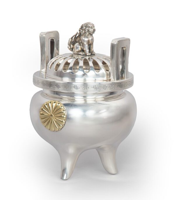 As part of our Japanese works of art collection we are delighted to offer this large Meiji (1868-1912) or early Taisho Period( 1912-1926) pure silver Koro by the highly aclaimed Imperial artist Tsukada Shukyo (1848-1918), on this occasion in collaboration with Kurokawa Yoshikatsu. The globular body set on three legs with loop handles is inspired by the ancient Chinese ding form. The front and reverse each finely decorated with the Imperial chrysanthemum crest (kikkamonshō, 菊花紋章), rendered as a stylized chrysanthemum with sixteen full and sixteen half petals arranged in alternation, a motif reserved exclusively for the Japanese Imperial Household and among the most important state and symbolic emblems of Japan. The upper rim encircled by a continuous key-fret band. The cover finely pierced with a stylized chrysanthemum motif surmounted by a seated shishi. This larger scale incense burner fully signed, Teishitsu Gigei-in Tsukada Shûkyô and kaô, this particular signature would indicate a date of manufacture between 1913 when Shukyo was granted the Imperial artist status ( Teishitsu Gigei in) and his death in 1918.