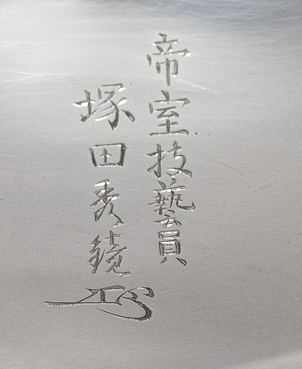 Tsukada Shûkyô (塚田秀鏡, 1848-1918), also known by his art name Shinyusai (真友斎), was a distinguished Japanese metal artist of the Meiji period. His art name pays homage to his mentors: ‘Shin’ from Shibata Zeshin (1807-1891), a renowned painter and lacquer artist, and ‘Yu’ from Kano Natsuo (1828-1898), a master metalworker. Under their tutelage, Shûkyô honed his skills in both painting and metalwork, leading to a unique fusion of these disciplines in his creations. In 1913, Shûkyô was appointed as an Artist to the Imperial Household (Teishitsu Gigeiin), a prestigious title awarded to artists who made significant contributions to Japanese art and culture. This recognition followed his demonstration of metal carving techniques to Emperor Meiji, highlighting his exceptional craftsmanship. Shukyo’s works are celebrated for their intricate designs and the use of various metal alloys, many of these masterpieces are preserved in the worlds leading collections and museums including the Khalili collections and Sannomaru Shozo Kan (The Museum of the Japanese Imperial Collection).