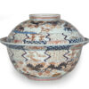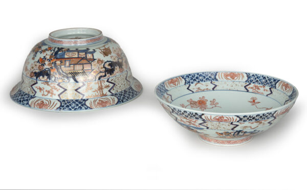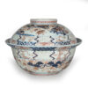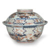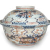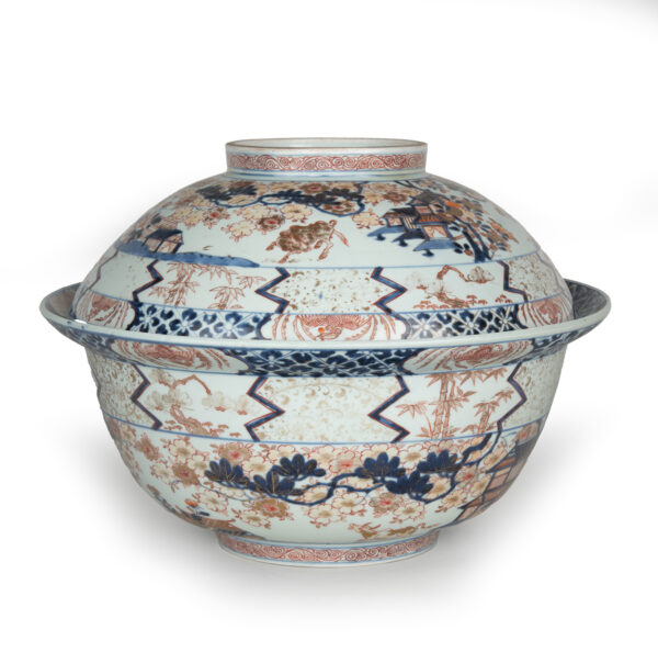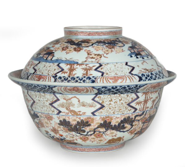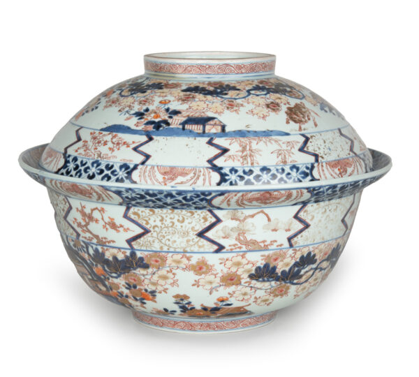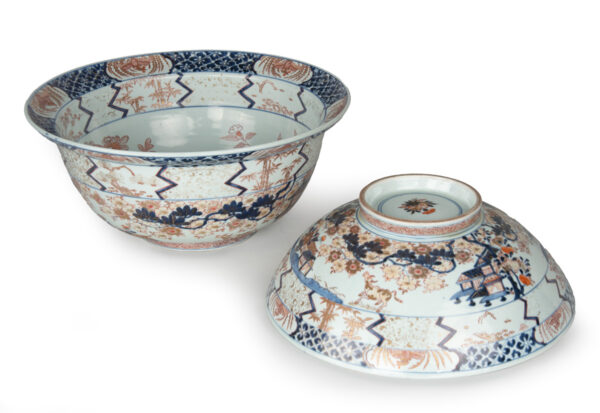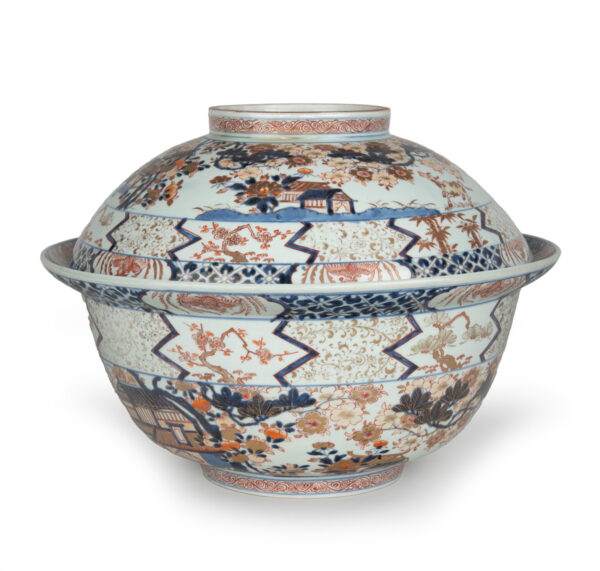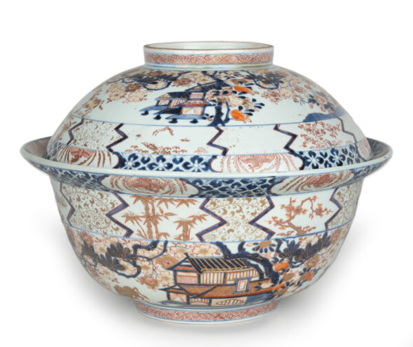 As part of our Japanese works of art collection we are delighted to offer this rather large scale Edo Period (1615-1868) Imari bowl and cover, produced at the kilns of Arita during the Genroku period circa 1700 and likely destined for an important European country house of the period. The deep bowl with flared rim is decorated in traditional Imari pallette with pavilions in landscape garden settings set within formal decorated borders, the similarly decorated lid is unusually also decorated with scenes of prancing cattle. This highly decorative and functional ceramic bowl is in remarkably good condition and would make a bold statement in any room of your choice, a rare survivor of some 300 years .