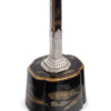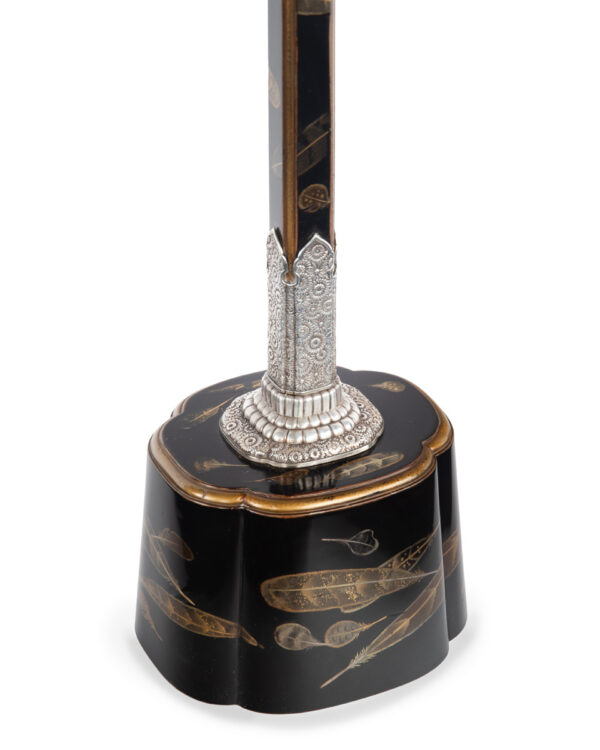 As part of our Japanese works of art collection we are delighted to offer this outstanding Meiji Period (1868-1912) pure silver and mixed metal koro in the form of a majestic hawk resting upon its perch. The highly revered 19th century artist, Sano Takachika, has skilfully captured the bird in a striking pose standing upon one leg apparently focussed on its distant quarry. Breathtaking attention to each and every detail, from the finely deliniated featherwork to the menacing gilt and shakudo eyes, this hawk certainly grabs the attention of the room . A section of pierced feathers upon its back lift off to reveal a silver lined recepticle for the purpose of  burning incense ( koro), the inside of this lid fully signed by Takachika. The hawk rests upon a black lacquer perch decorated with multi colour lacquered feathers, further adorned with sumptuous carved silver mounts. A quite magical yet powerful okimono from the hand of one of the most highly skilled metalworkers of the late 19th century.