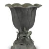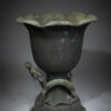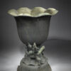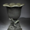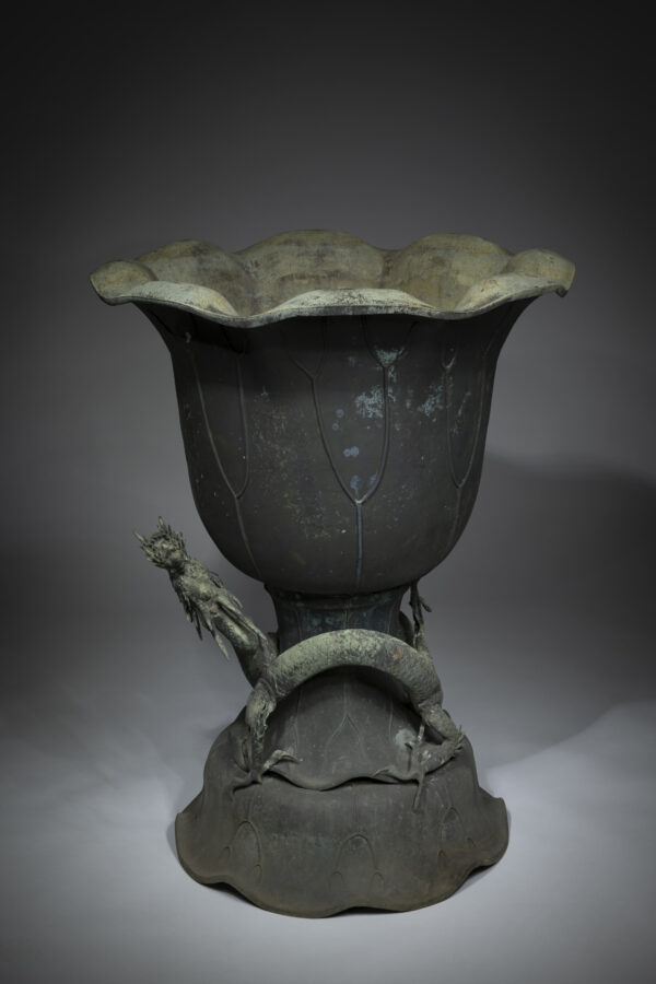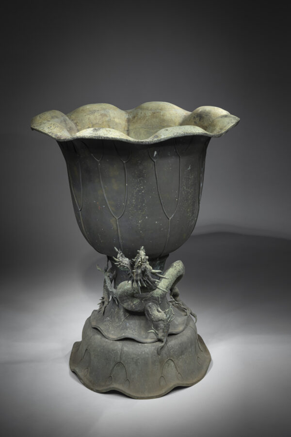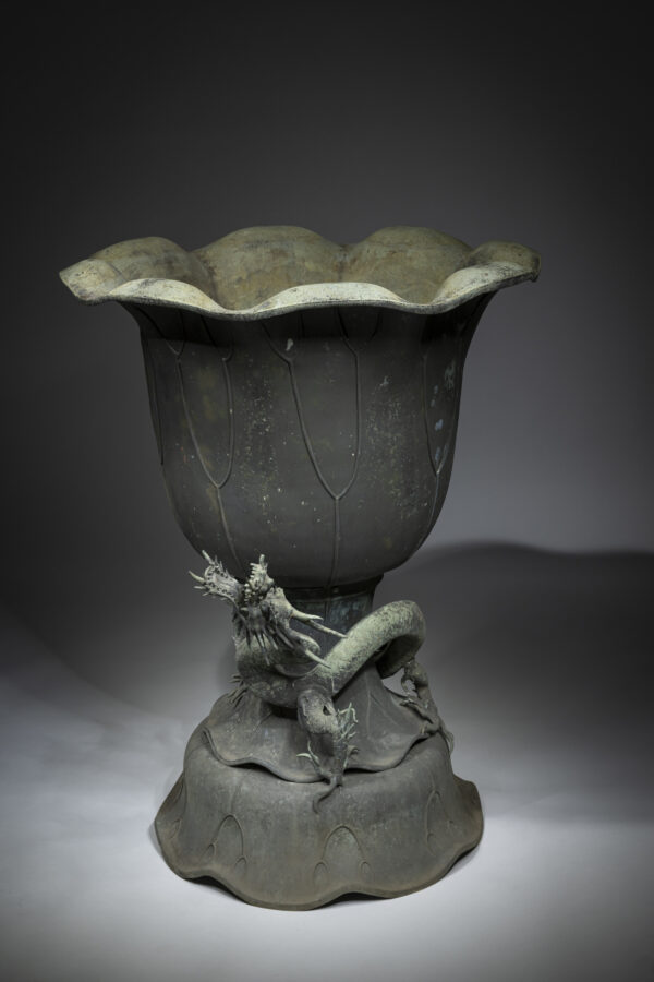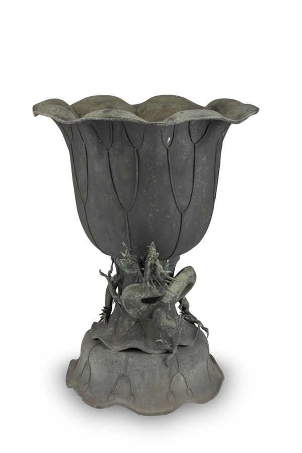 The large scale vase or water feature cast in shape of a round lotus leaf, a top a smaller lotus leaf that rests on another lotus-leaf that serves as the base. Around the neck a separately cast and finely executed figure of a dragon with a raised head and a mouth wide open.