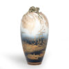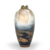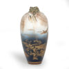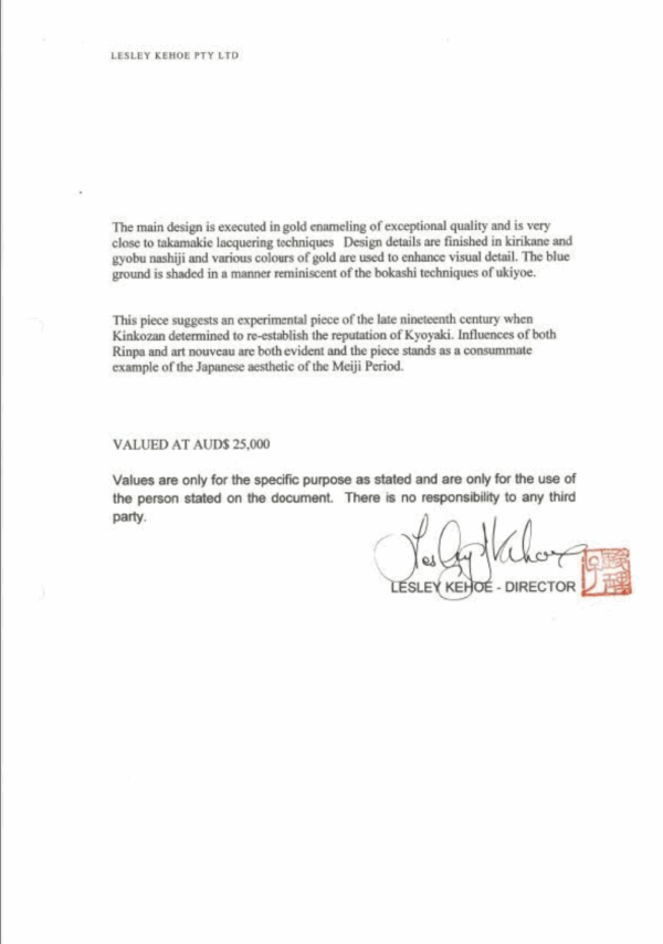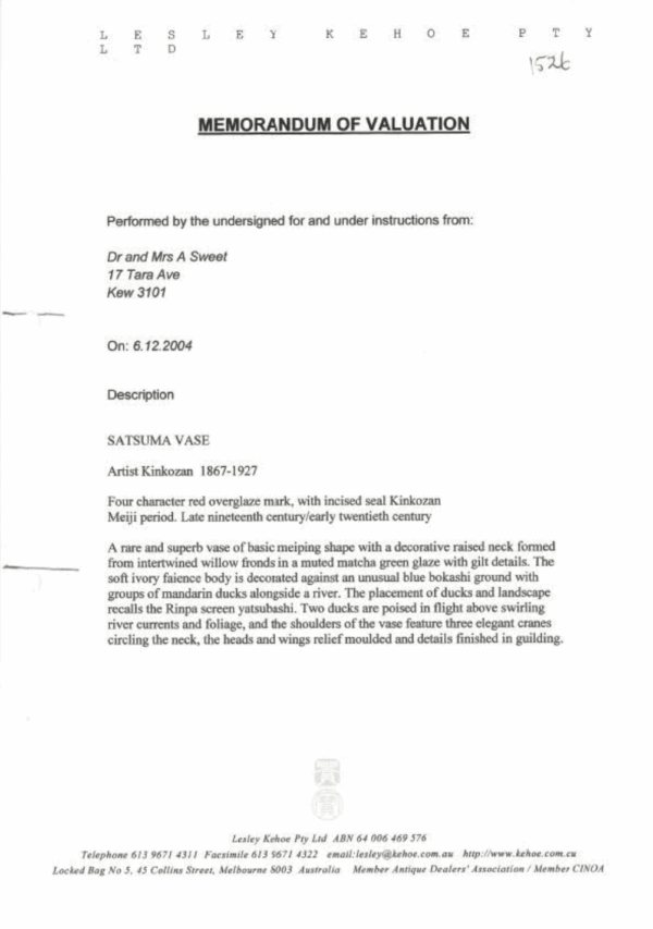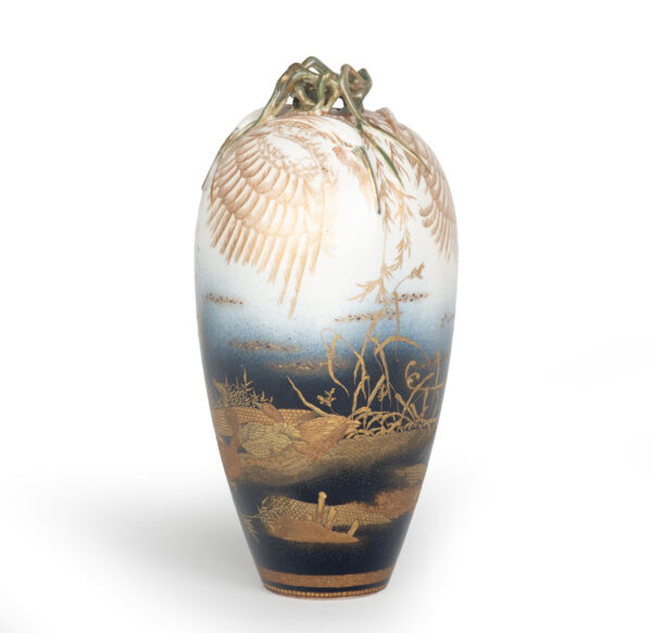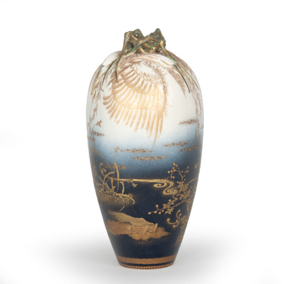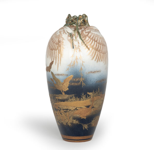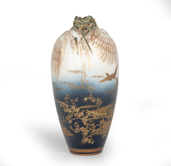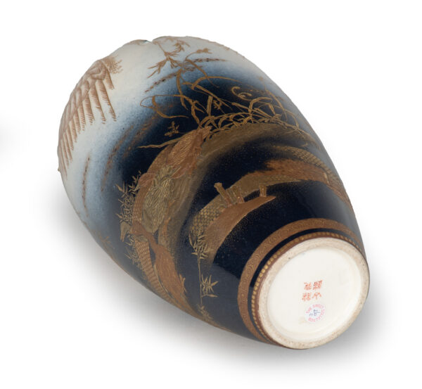 As part of our Japanese works of art collection we are delighted to offer this most unusual Meiji Period (1868-1912) Satsuma vase stemming from the highly regarded studios of Kinkozan. The raised in relief neck is encircled by three Manchurian cranes beneath entwined willow fronds, the graduated cobalt blue and cream body finely decorated with scenes of Mandarin ducks in flight and at rest amidst a waterside setting. The underside of the vase bears a red four character signature as well as an impressed mark for the Kinkozan of Kyoto studios, as well as the old collectors label. A most unusual vase to add to your Japanese ceramics collection .