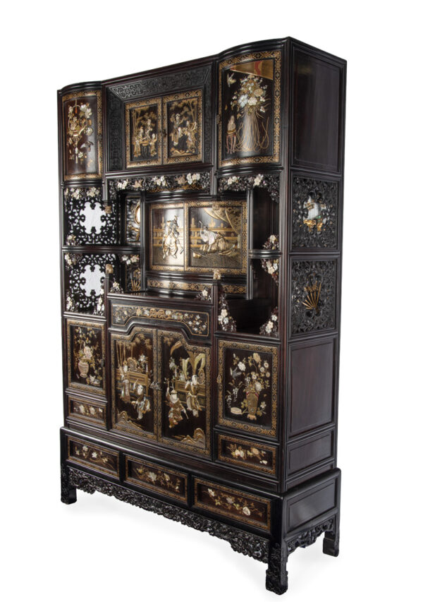 As part of our Japanese works of art collection we are delighted to offer this finely decorated Meiji Period (1868-1912) hardwood display cabinet ( Shodana). This dense native hardwood cabinet has been designed to house a combination of sumptuous gold lacquer doors and drawers within the carved and pierced main carcass, some of the doors bowed adding to the complexity whilst others slide on runners. A fascinating array of scenes are brought to life with the clever use of lacquer and Shibayama decoration to the door and drawer fronts, unsually including a swordsmith at work to one main panel, demons, jovial bands of musicians, fans and birds within traditional ikebana displays form the basis of decoration for the remainder. The shelves are further decorated with complex fretwork depicting ivory birds in flight amidst mother of pearl flora, with fine ivory shi shi as guardians to the central featured area, the remainder of the carcass either blind fret carved or once again gold lacquer decorated to an exceptional standard. This cabinet comes in two parts for ease of transportation and is of a size that will sit comfortably within most room settings. This cabinet represents one of the finest quality and most aesthetically pleasing examples we have owned.