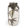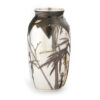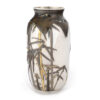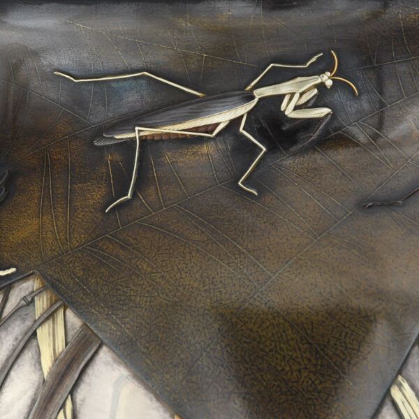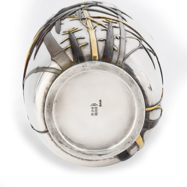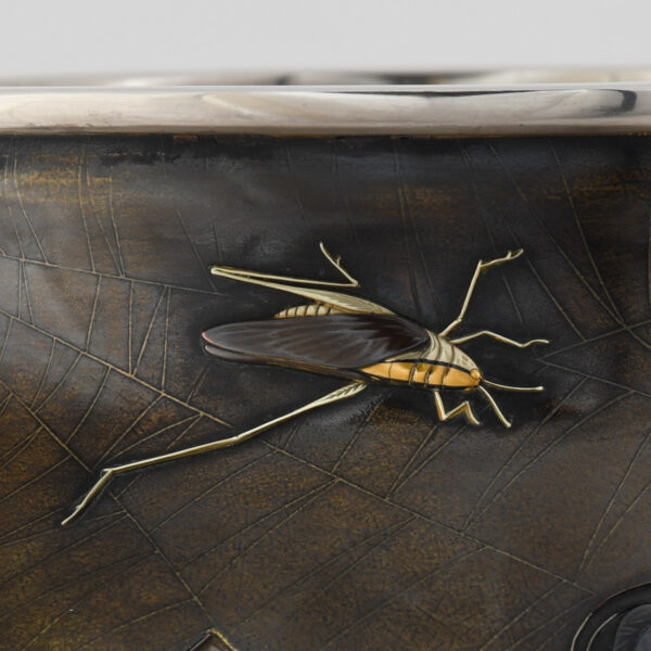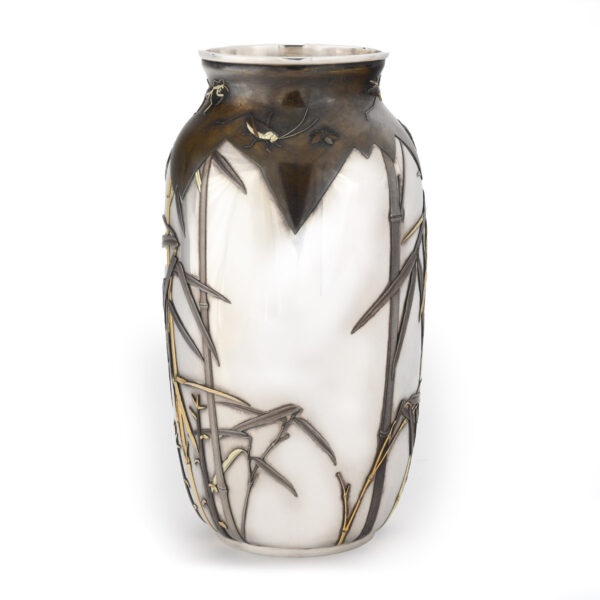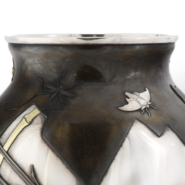 As part of our Japanese works of art collection we are delighted to offer this incredibly scarce Meiji period (1868-1912) silver and mixed metal vase, produced at the Kiritsu Kosho Kaisha almost certainly under the directorship of lead artist Suzuki Chokichi (1848-1919) his art name Kako. The main body of this large and heavy silver vase is predominantly decorated with sprigs of bamboo formed from alloys including shibuichi, shakudo, copper and gold, nothing too unusual there, however the shoulders give rise to a more complex use of alloys and a style more typical of Kako’s extravagant designs, a striking and quite radical angular alloy is overlaid onto the silver body, this unique olive green textured alloy has been painstakingly etched back to reveal a very fine cobweb in low relief. This most unusual decoration is adorned with an array of spectacular quality mixed metal insects to include moths, spiders, dragonfly, praying mantis and locust to name a few, each insect manufactured from alloys including gold, silver, shibuichi and shakudo, a most dramatic and quite remarkable display of craftsmanship that seemingly Chokichi would have produced during his tenure as lead artist at the government owned and sponsored Kiritsu Kosho Kaisha, during the mid Meiji period , certainly prior to 1891 and the cessation of the company, the underside of the vase is signed Kiritsu Kosha Kaisha Sei under the trademark double mountain mark and is most unusually accompanied by a further silver mark “tsuka gin”, see literature below.