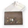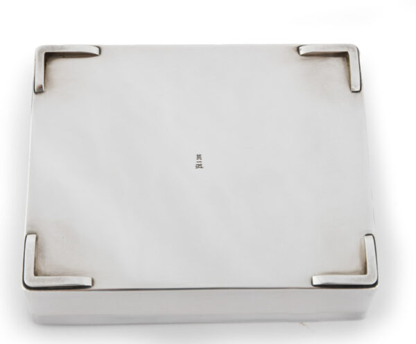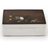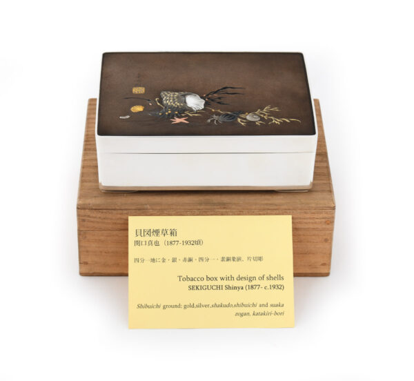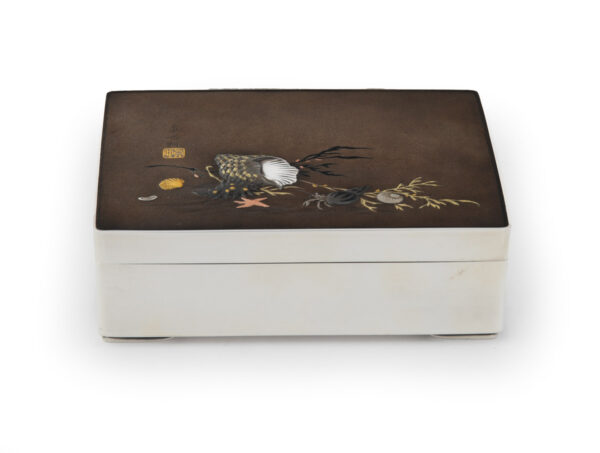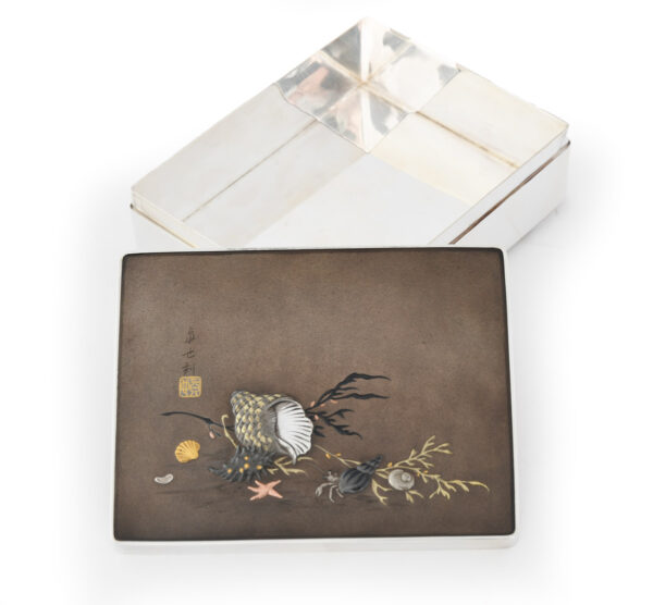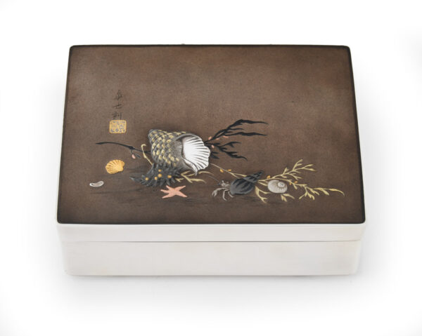 As part of our Japanese works of art collection we are delighted to offer this late Meiji period (1868-1912) early Taisho period (1912-1926) pure silver and mixed metal lidded box by the highly regarded artist Sekiguchi Shinya, his art name Chitokusai. This delightful box is manufactured from pure silver and stands upon bracket feet, the shibuichi and mixed metal top is most unusually decorated with Japanese marine life including seaweed, shells, molluscs, starfish and a hermit crab. A simple yet poignant snapshot of everyday staple foods that surrounded these shores, now brilliantly portrayed by an artist that would have likely enjoyed some of these seafoods in his diet. The lid bears an inscription that reads Shinya Koku (carved by Shinya) as well as sealed Shinya. A most charming box manufactured by a highly regarded and well recorded artist of the Meiji/ Taisho period.