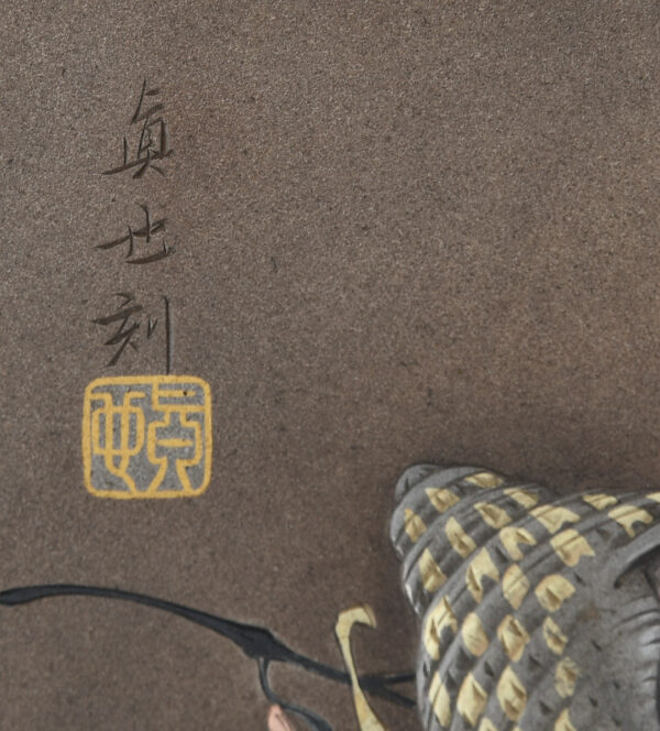 Sekiguchi Shinya was born in Tokyo as the son of the celebrated metalworker Sekiguchi Ichiya, who himself was under the tutelage of Goto Ichijo (1791-1876), he worked alongside his father from the age of 14 and first exhibited in 1895 at the fourth Naikoku Kangyo Hakurankai (National Industrial Exposition) aged just 18. His works are also recorded in the catalogues of the 1900 Paris Exhibition, and of the fifth National Industrial Exposition (1903).