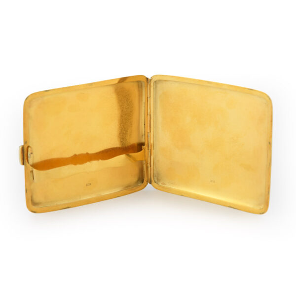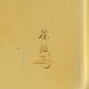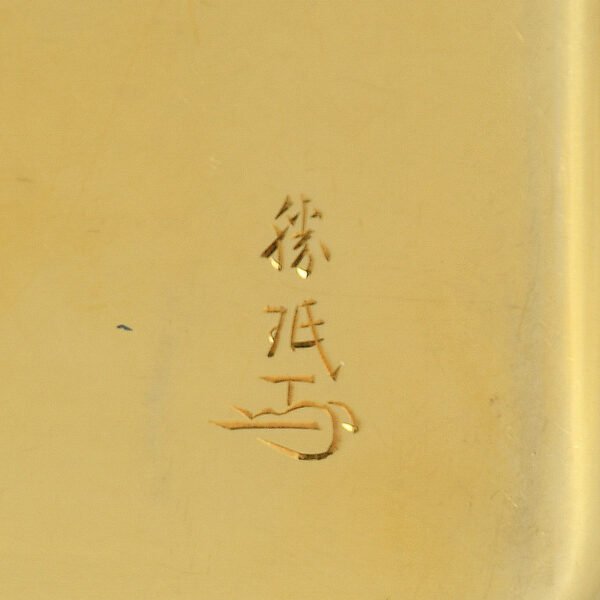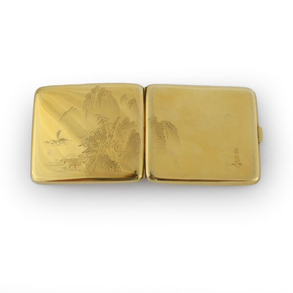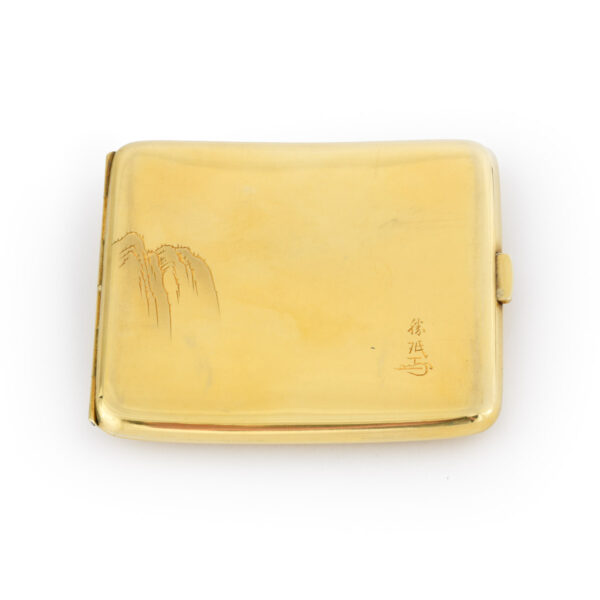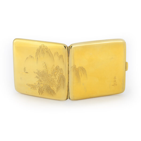 As part of our Japanese works of art collection we are delighted to offer this incredibly rare Meiji Period (1868-1912) pure gold cigarette case by arguably the most famous metalworker of the period, Unno Shomin 1844-1915. Here Shomin has skilfully chiselled a scene of a boat upon a lake within a mountainous backdrop, to the shore a pavilion rests upon a rocky outcrop beneath the pine trees. Shomin has utilised angled chisels in a technique refered to as Katakiribori to simply represent ink brush painting. The case comes complete with its original retailers box with a label that translates to a shop in Tokyo called Sanoya, Nihonbashi Ningyo-cho Telephone: (66) 0481. An incredibly rare example of gold metalwork from one of only a handful of luminary Imperial metalworkers of the period.